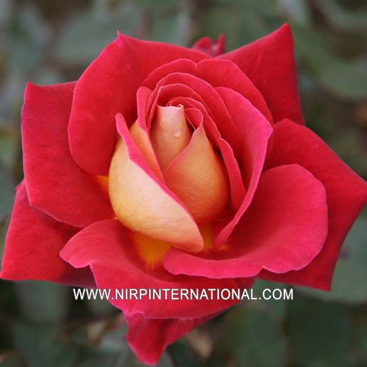 Great class for this large flowered bush rose with a tight lengthened bud with a not very common colour. The amber yellow petals on the reverse contrast wonderfully with the dark velvety red of the obverse. They keep theirs colours until the complete blooming of the flower (50 petals) that opens slowly. Marvellous double face variety. The rose bush with a dull dark green foliage blooms from spring to frost, without any interruption. Height: 80/100 cm.